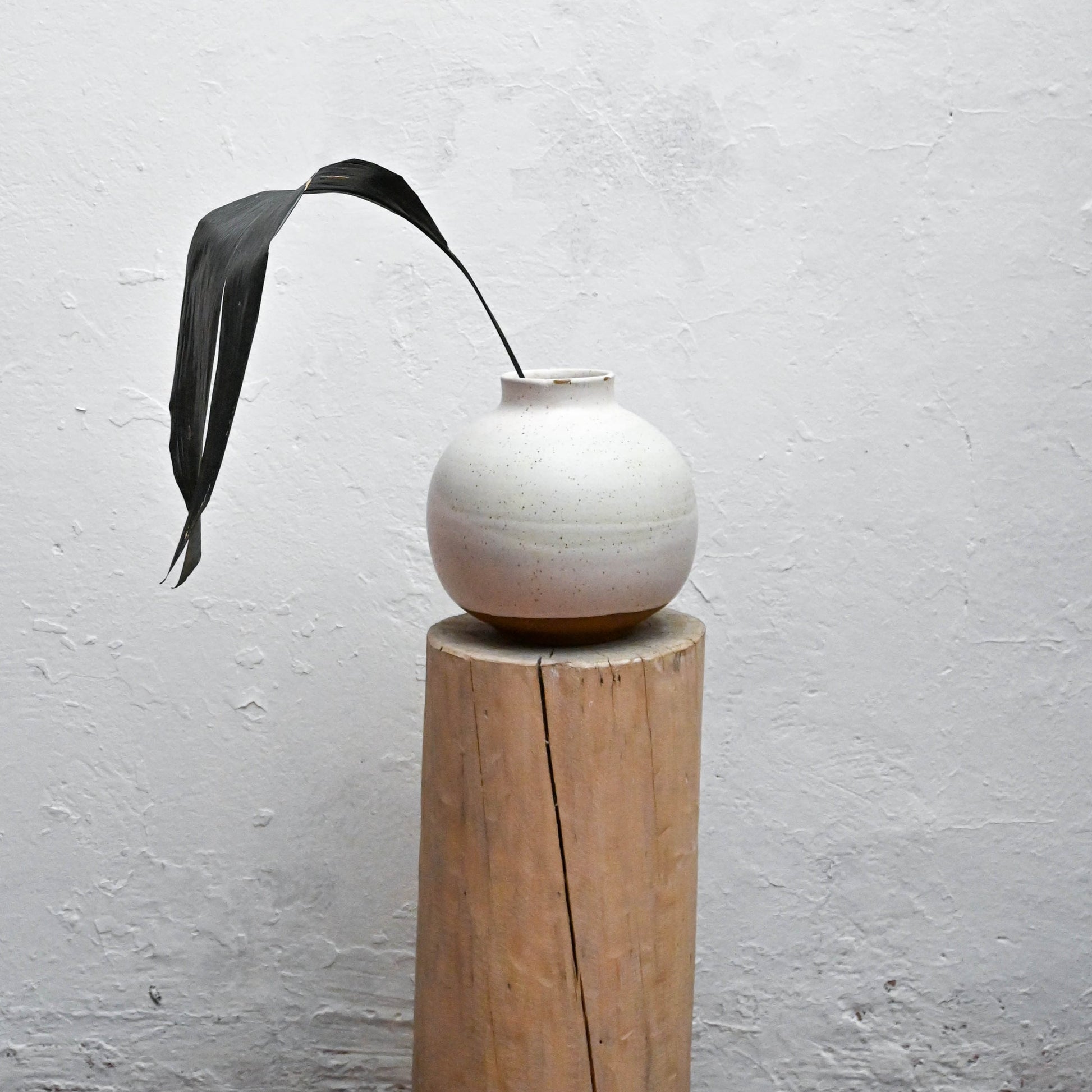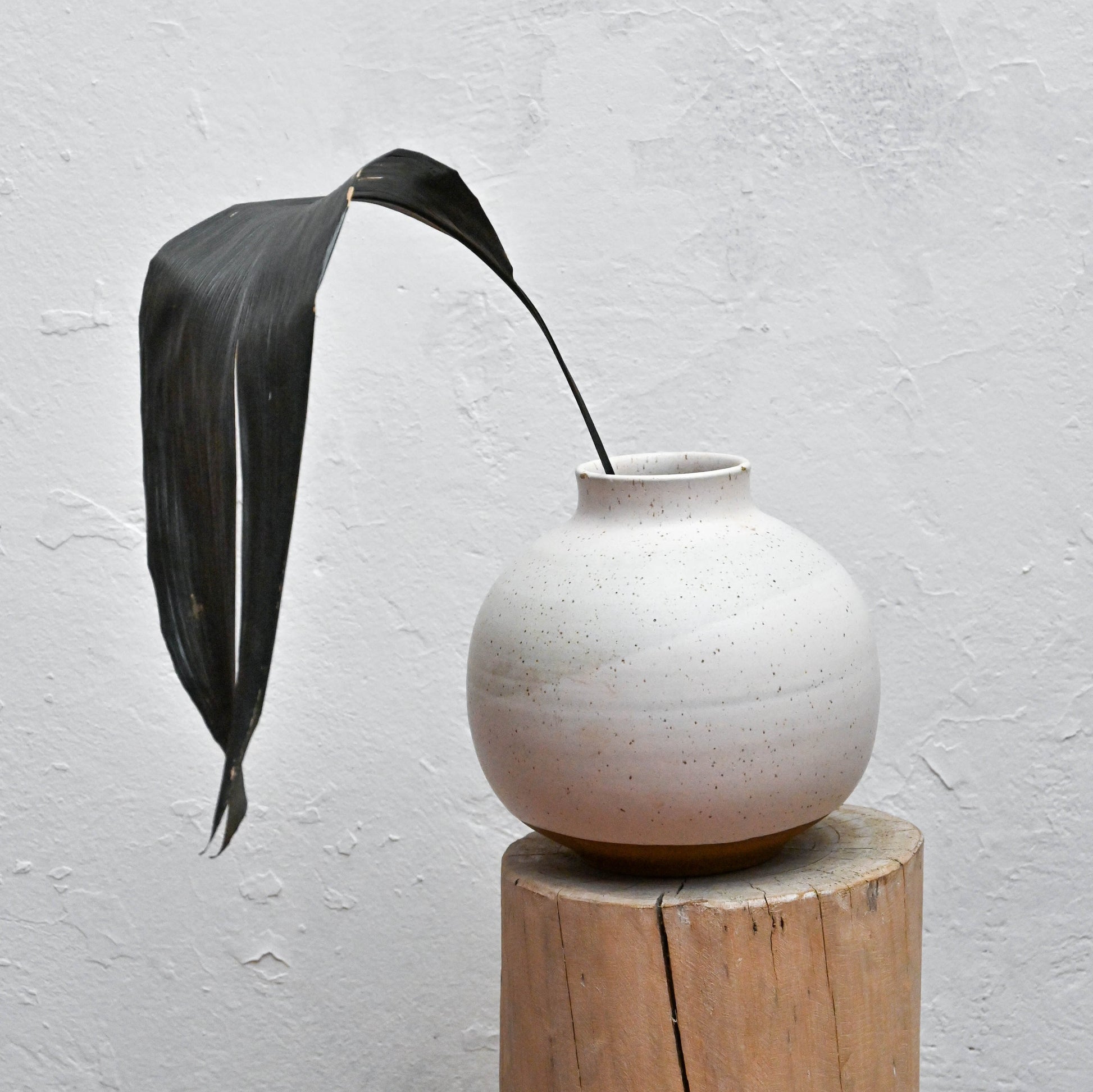 Jarrón de cerámica de gres, color blanco mate de cerámica tostada con puntos. Su forma clásica de forma geométrica.