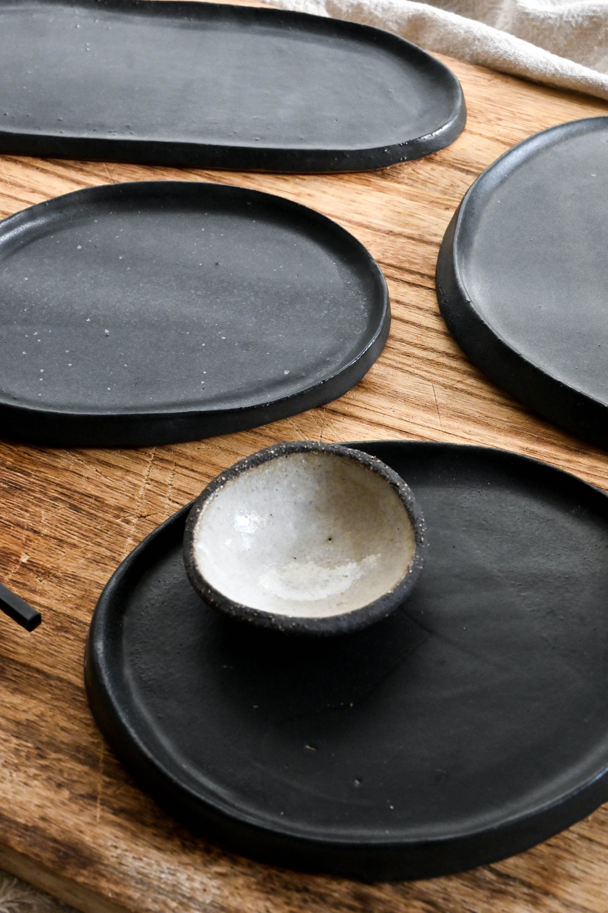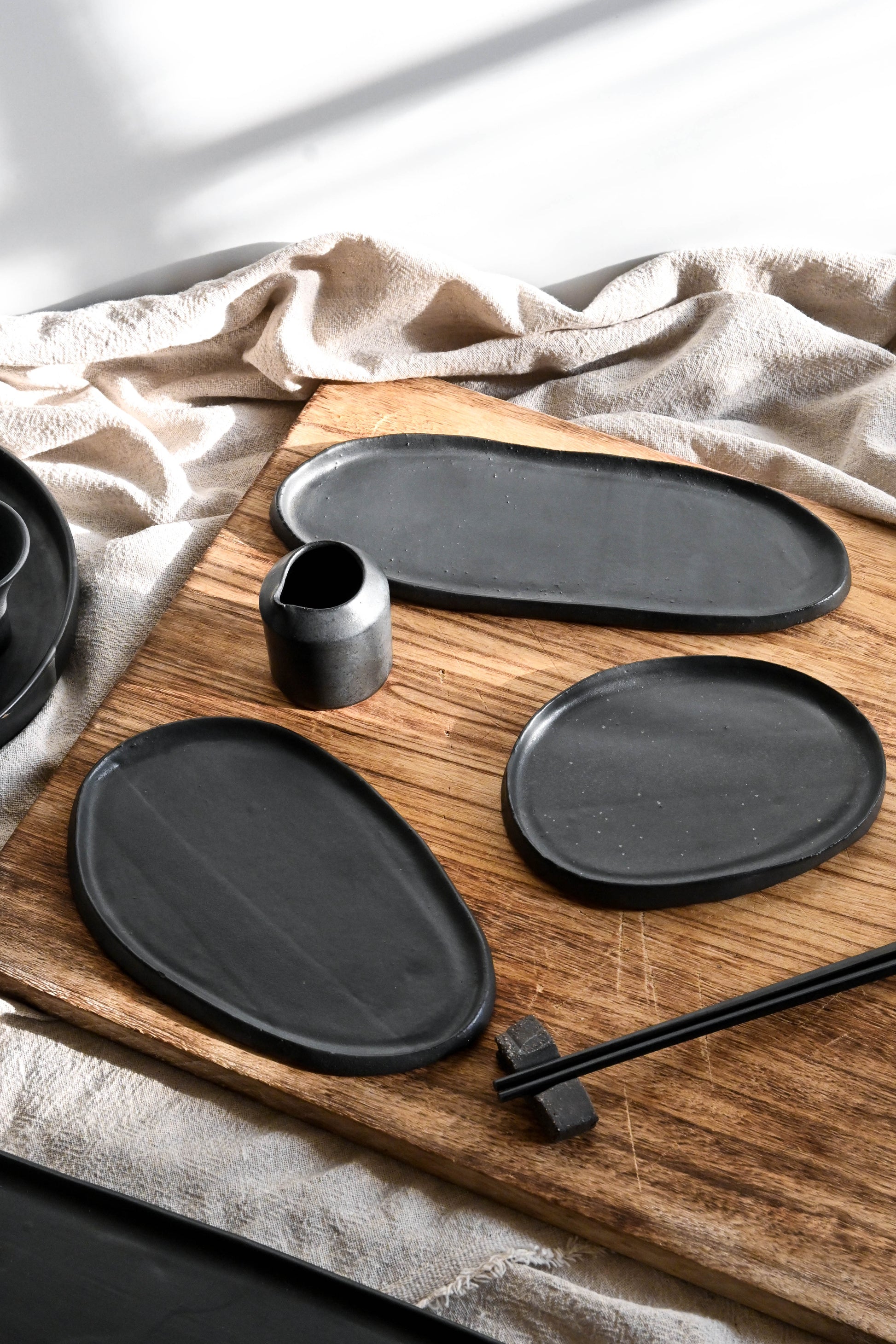 Platos planos irregulares de cerámica negros, ideales para picoteo, quesos, sushi, etc. Son todos diferentes, únicos y en varios tamaños. Pieza hecha a mano que valora el proceso de diseño y del material. Producto nacional.