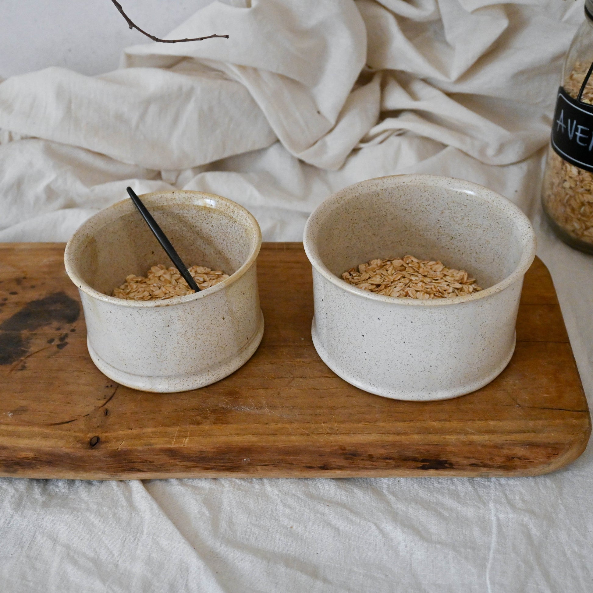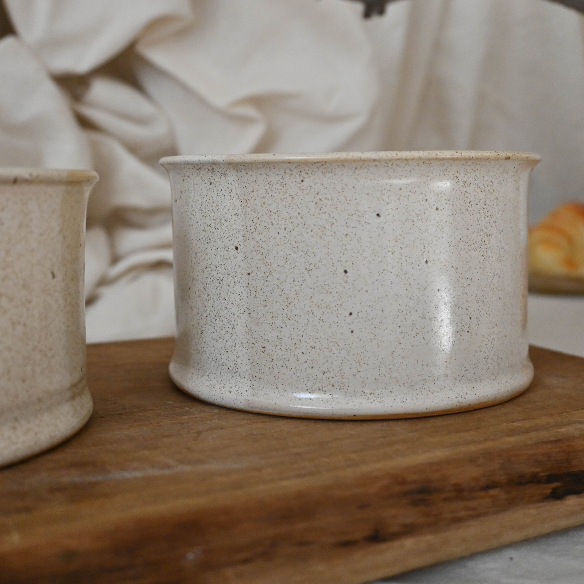 Pocillo recto de cerámica de gres, perfecto para picoteo, sopa o para contener alimentos. Color beige con puntos brillante. Piezas hechas a mano en chile.