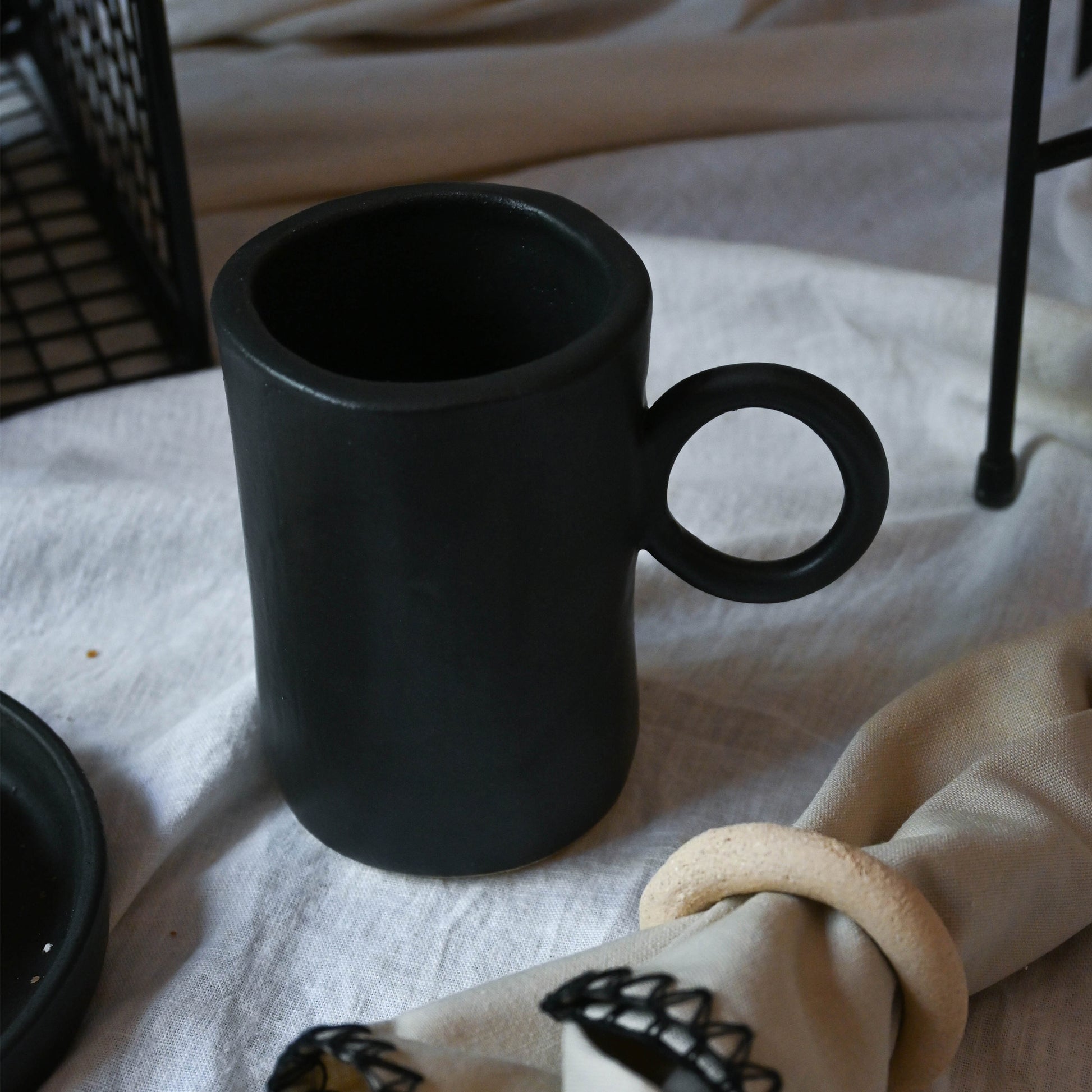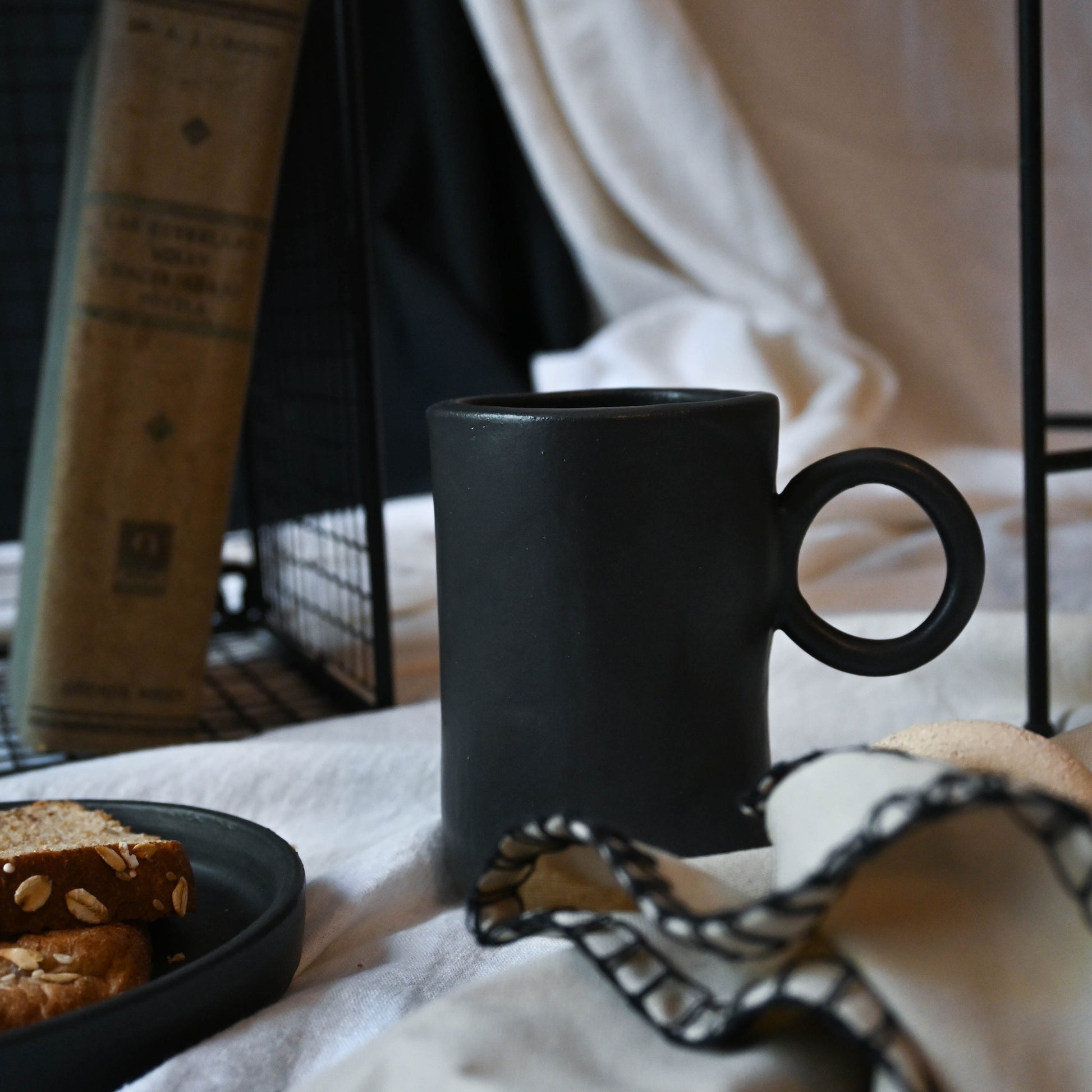 Taza simple de diseño original y geométrico, su asa toma el protagonismo al ser una argolla circular perfecta. Pieza hecha a mano que valora el proceso de diseño y del material. Producto nacional.