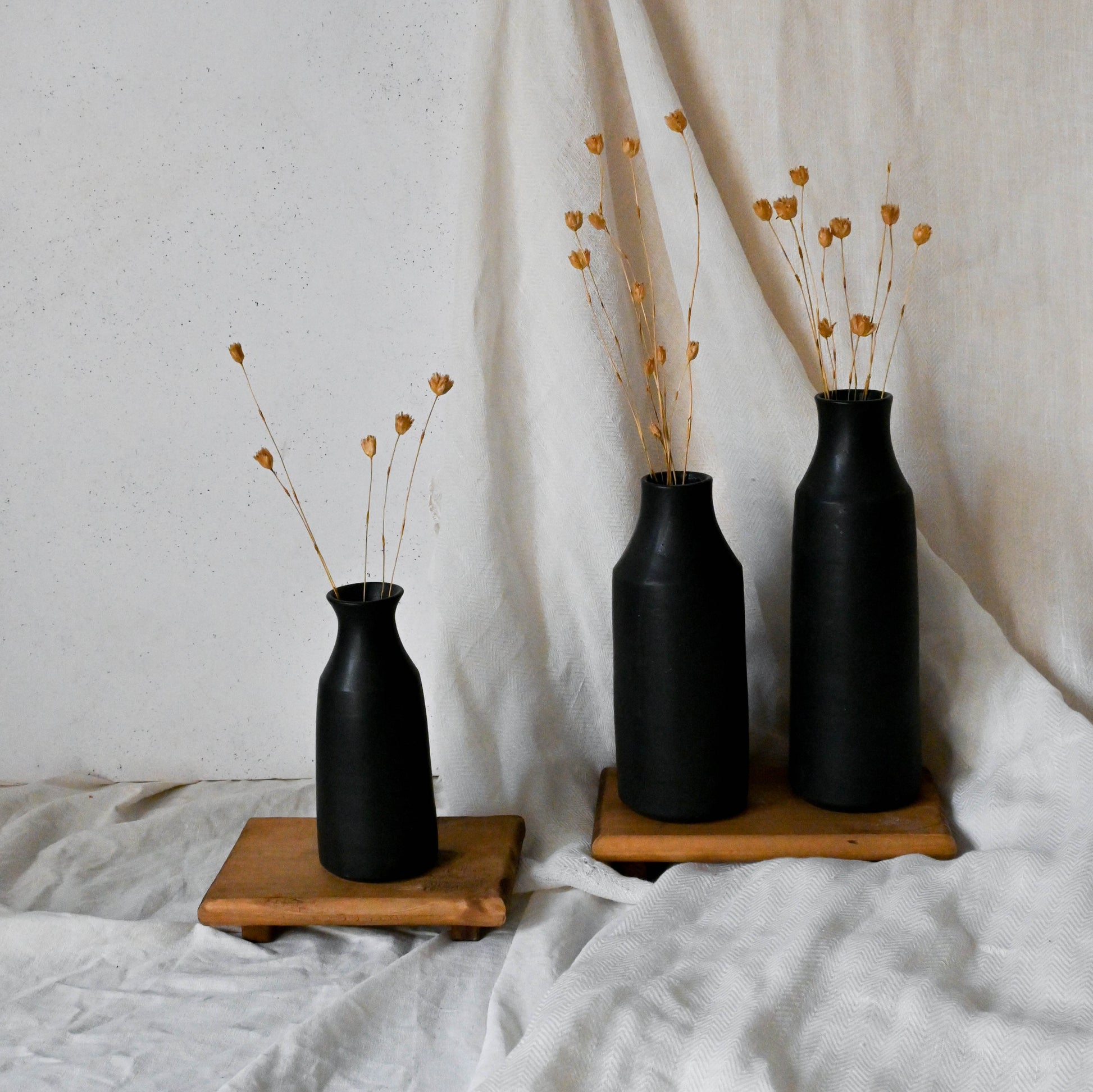 Un florero alto destaca por cuello pequeño y estilizado. Su diseño vertical proporciona una presentación impactante para arreglos florales, aportando un toque de gracia y verticalidad a la decoración.