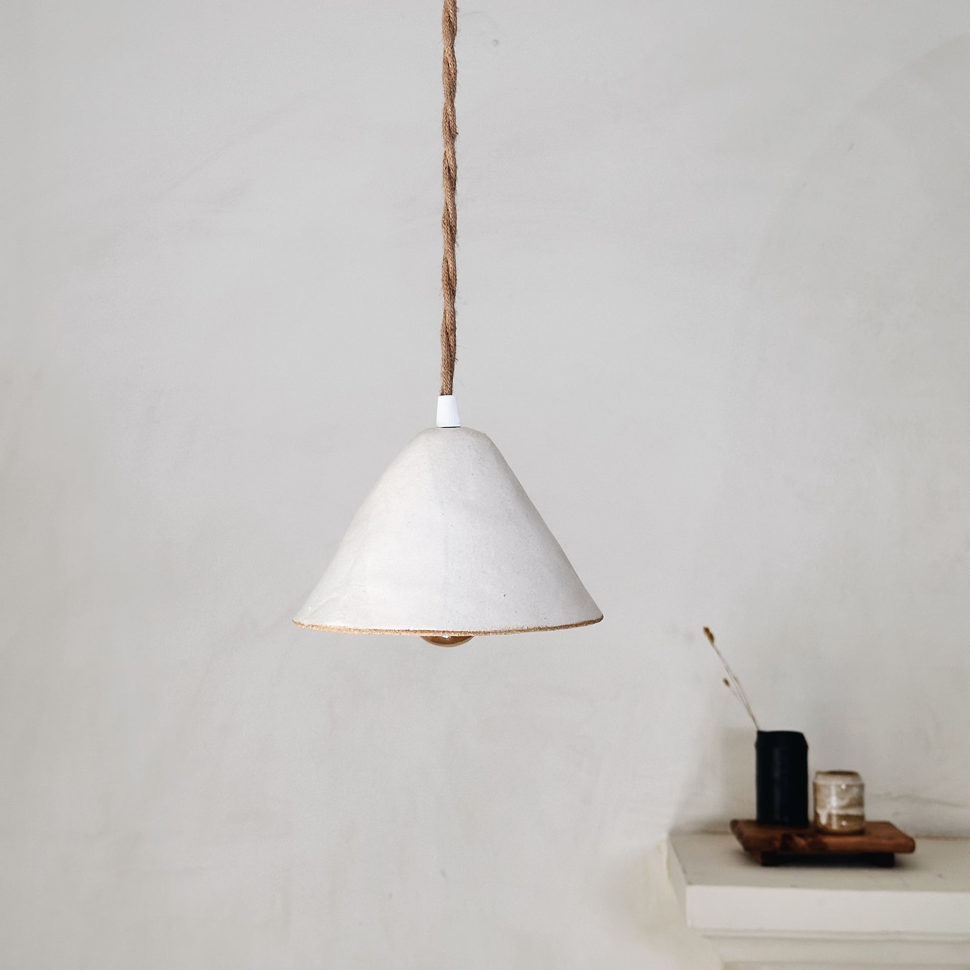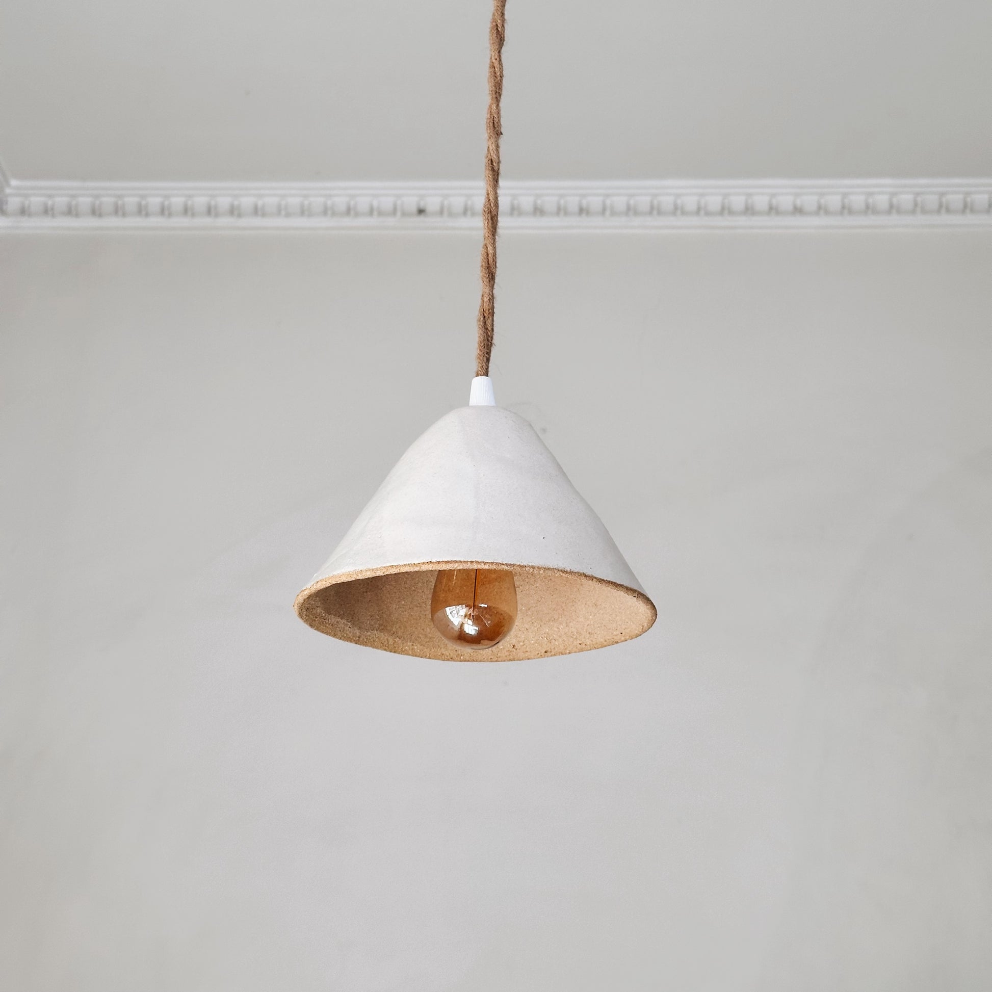 Lámpara de cerámica de gres blanca mate lisa. Forma clásica, abierta y de luz amplia. Ideal para una cocina, o para un espacio abierto.