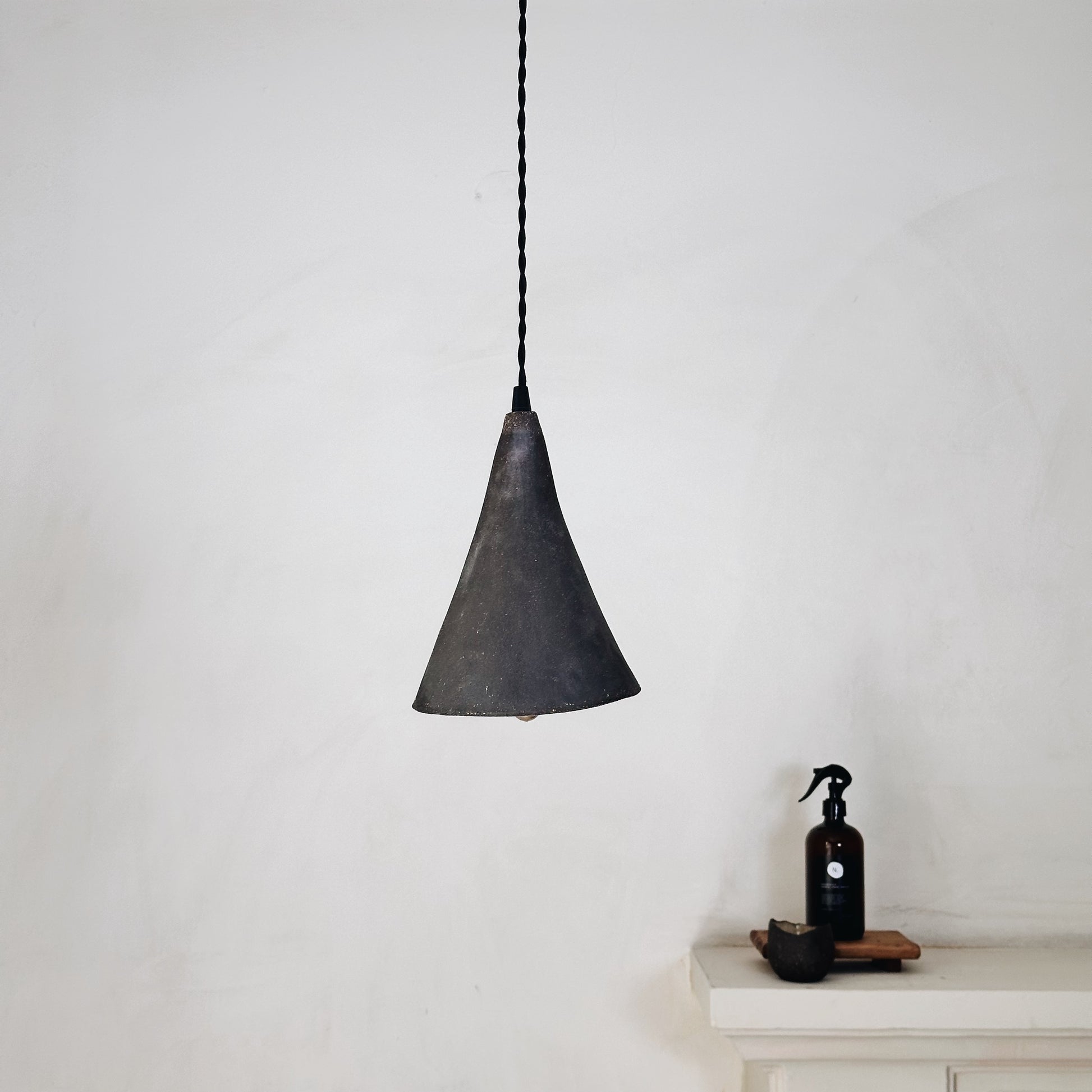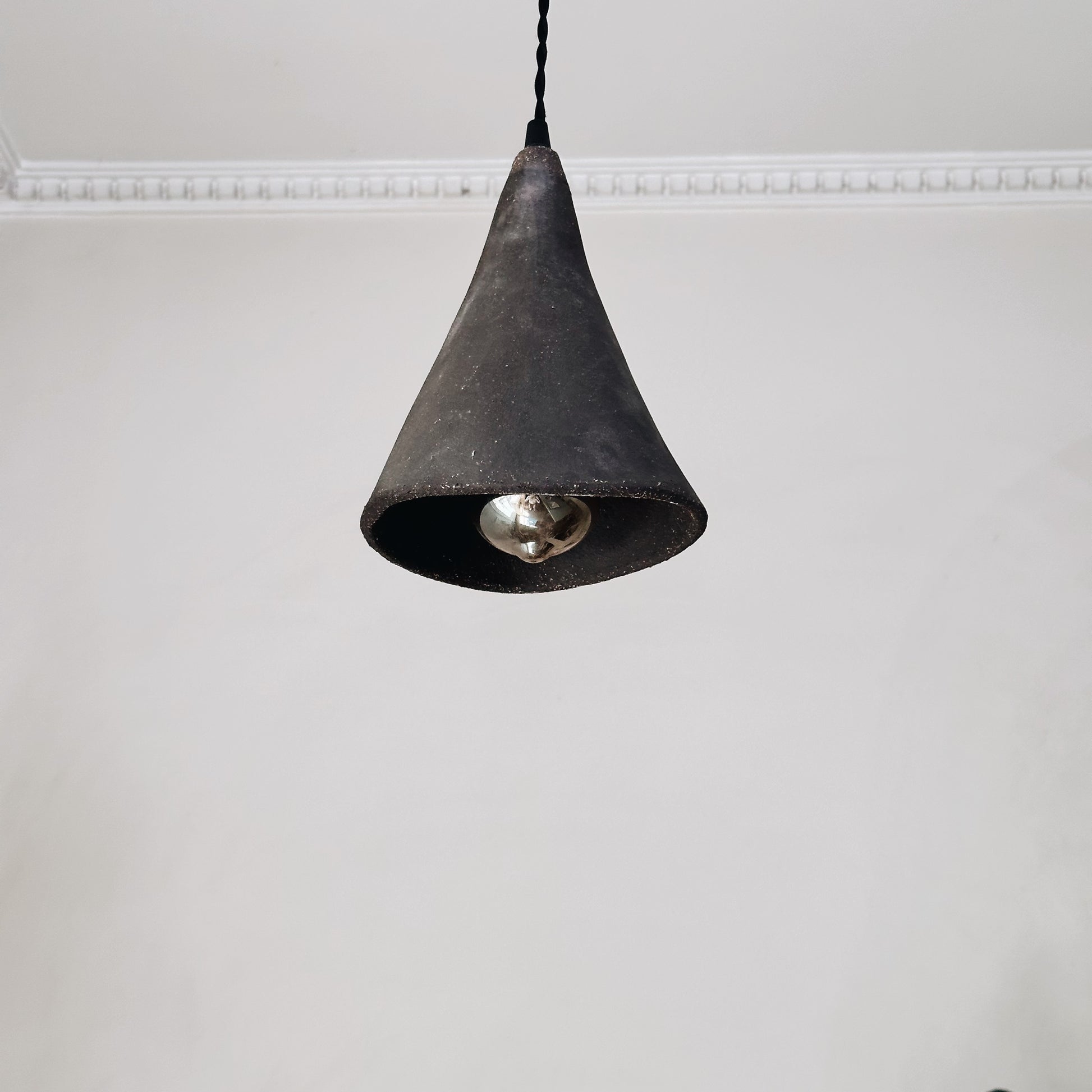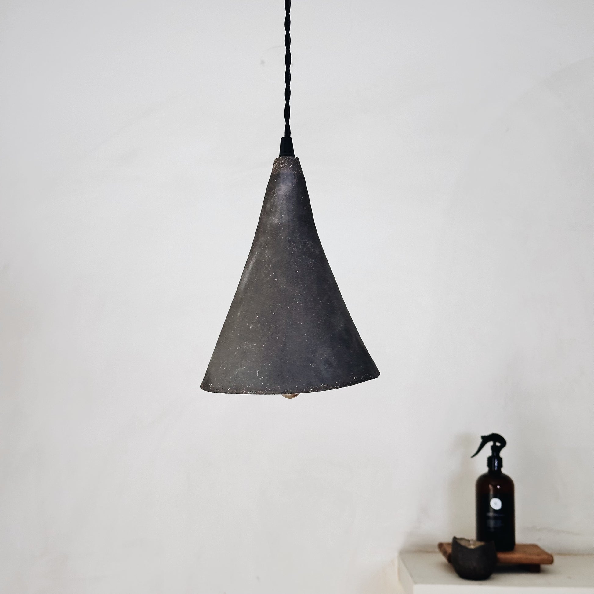 Lámpara de cielo de forma Cono Negro, modelada 100% a mano, por lo cual ninguna es igual a la otra. La idea es tener una pieza exclusiva colgada del cielo que entregue luz cálida y calidez en su forma y textura.