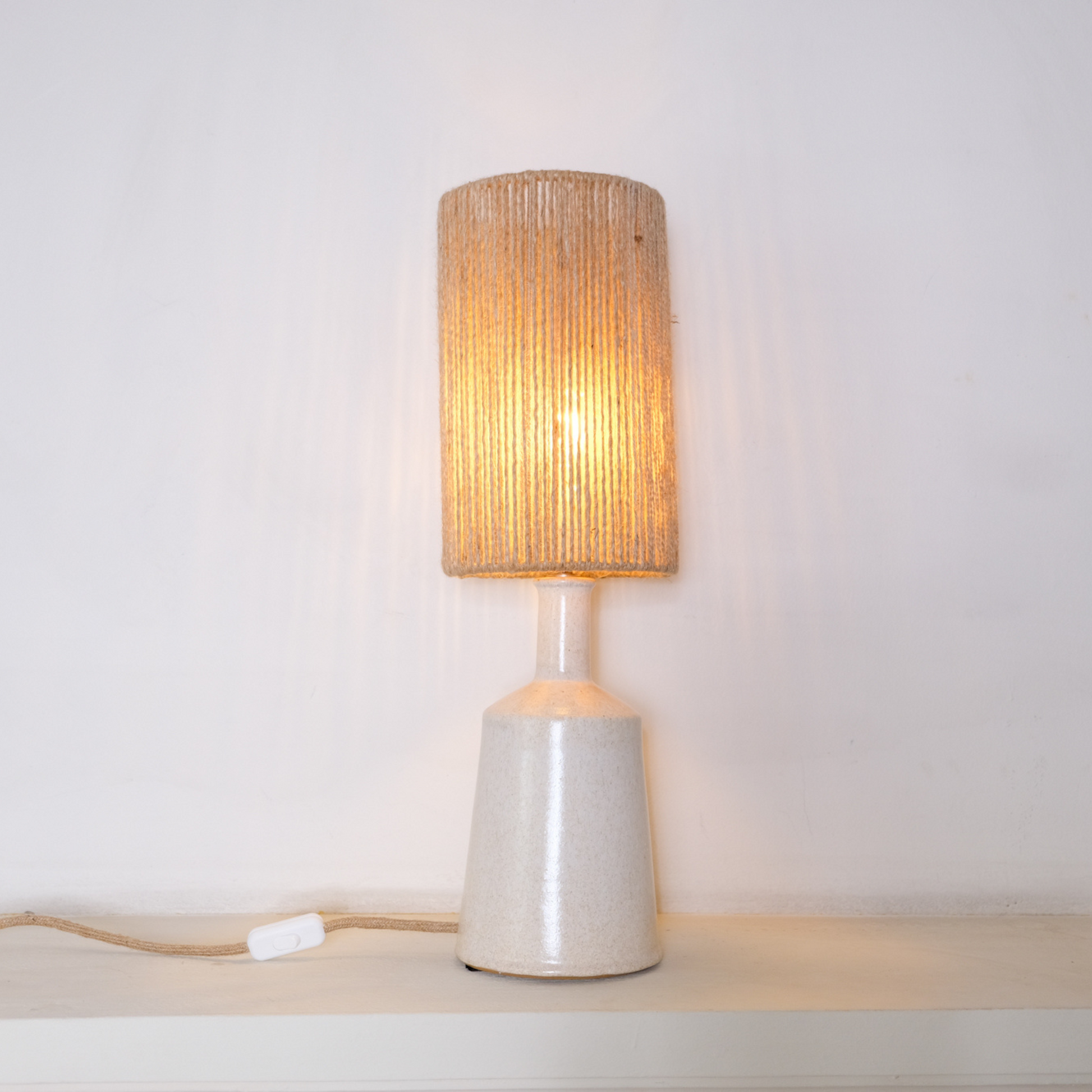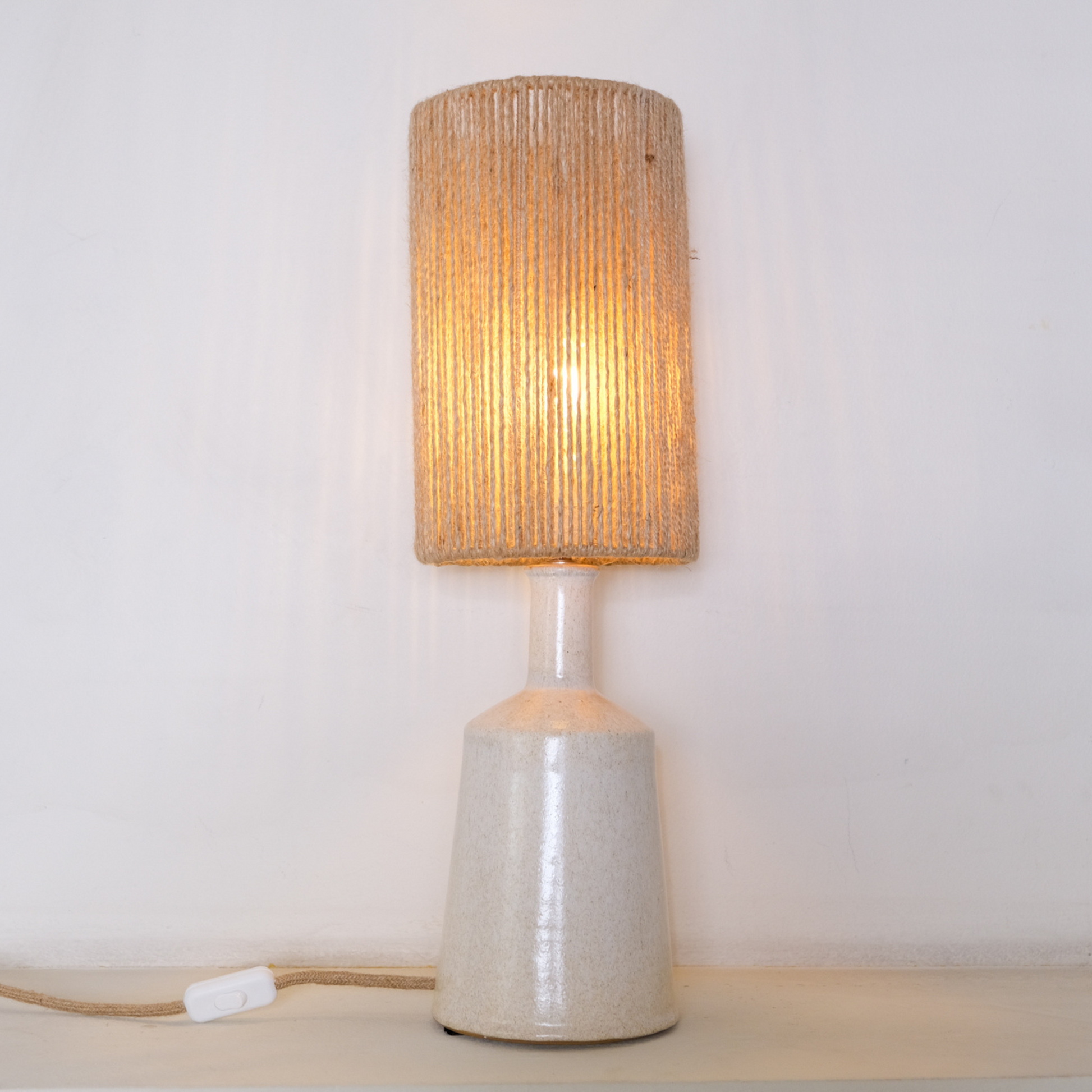 Lámpara con base de cerámica gres y pantalla de yute natural, crea una combinación armoniosa entre lo moderno y lo natural. La cuidada artesanía y los materiales de calidad la convierten en una pieza única que ilumina y embellece con estilo.