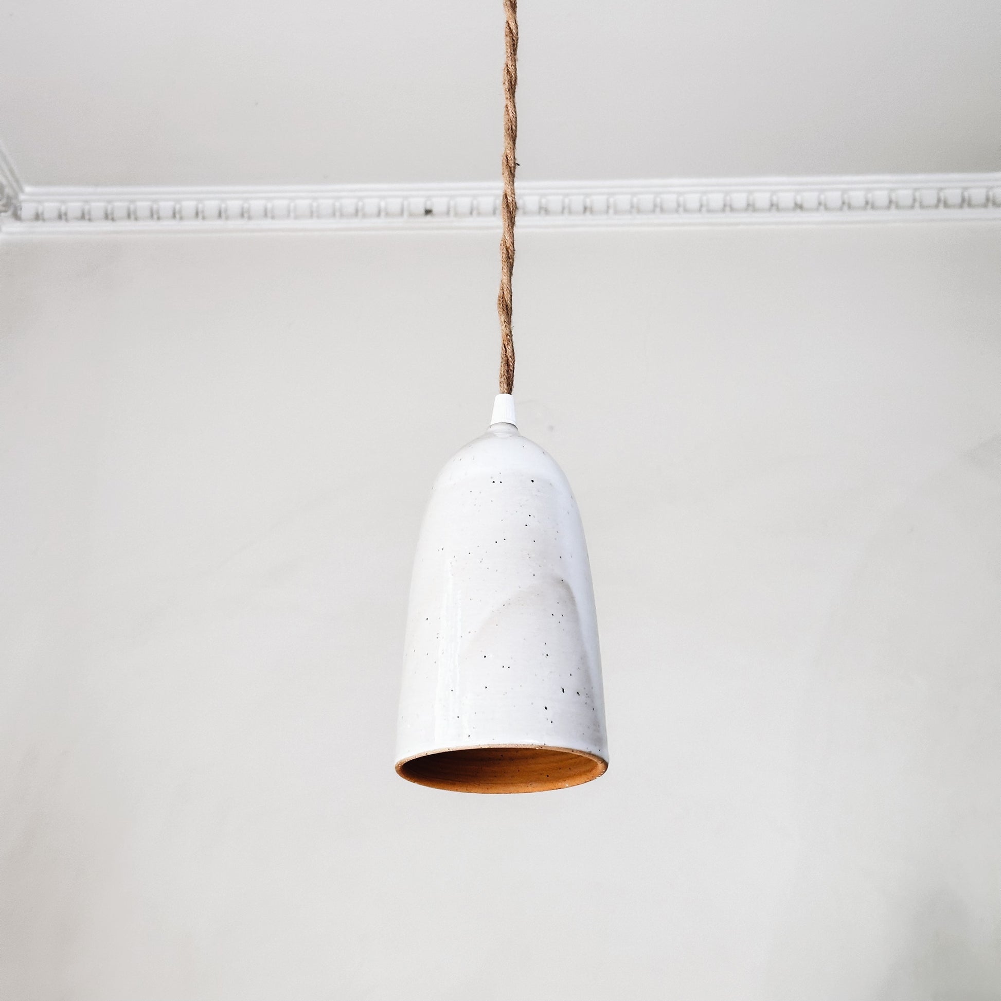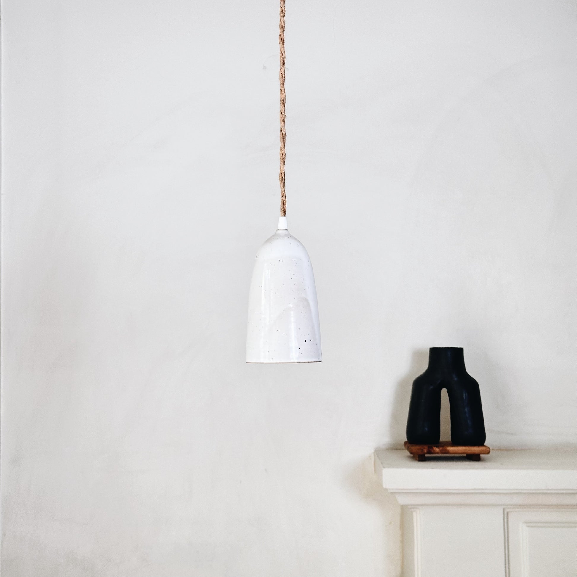 Lámpara de cielo ovalada hecha a mano de cerámica gres. La cerámica gres es conocida por su durabilidad y textura única, lo que le da un toque especial a la luminosidad de la luz. El color blanco suele ofrecer una luminosidad suave y una sensación de amplitud en el espacio donde se utiliza, además de combinar fácilmente con una amplia gama de estilos de decoración.