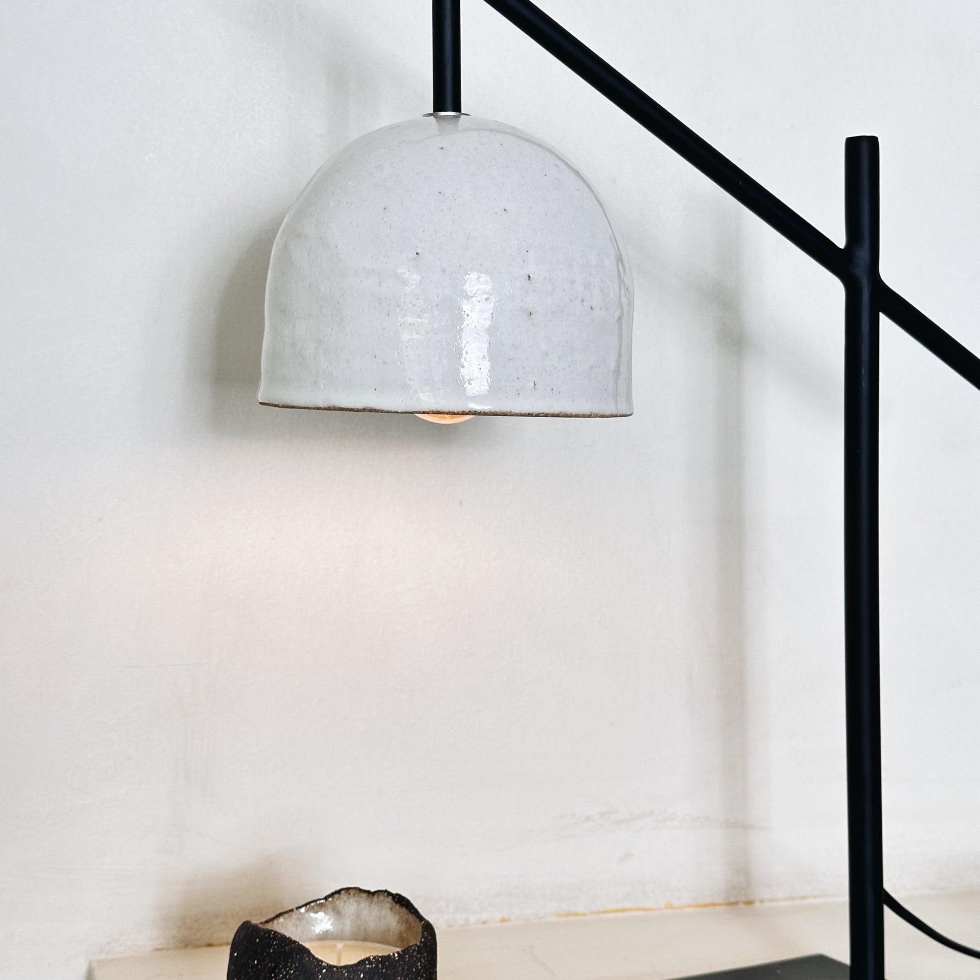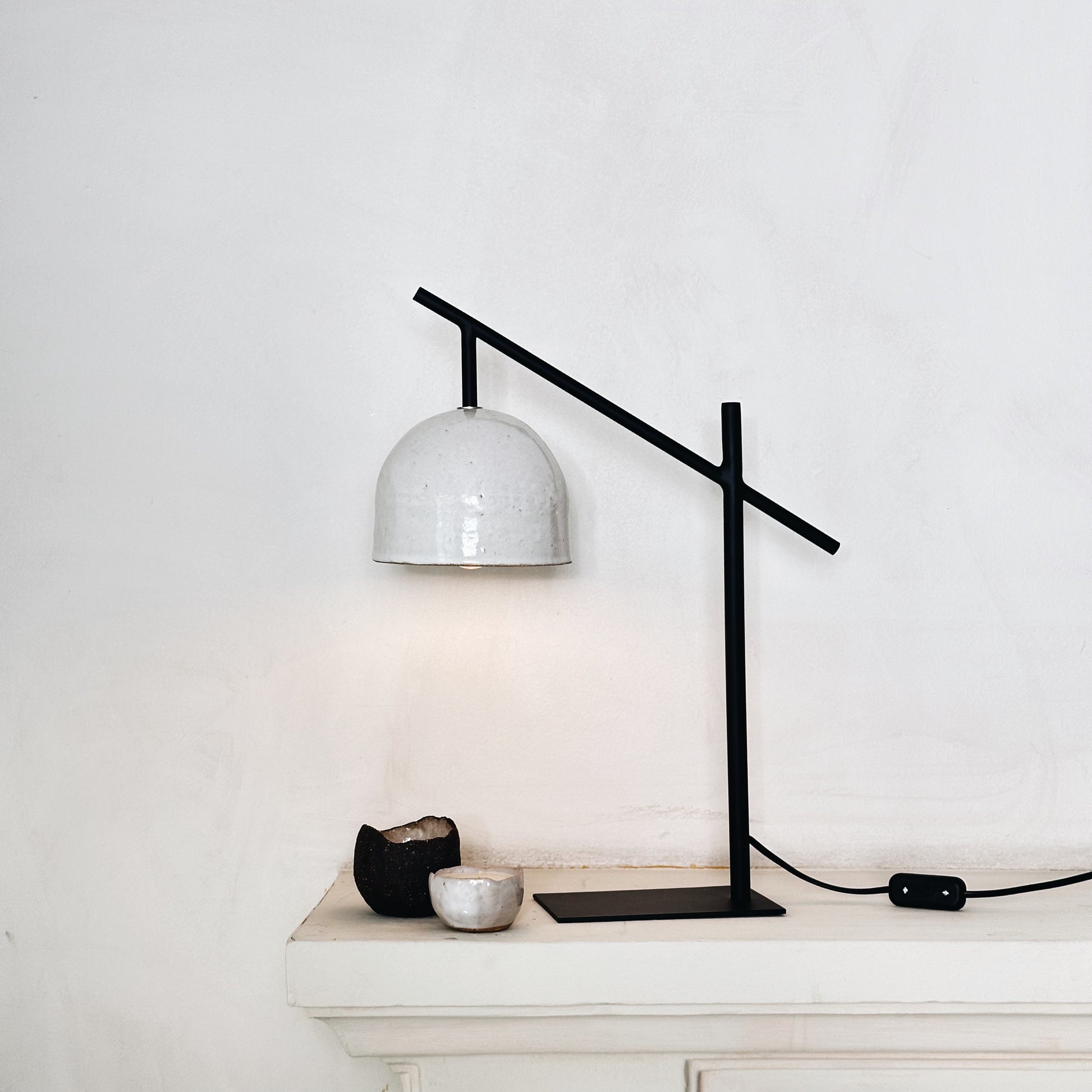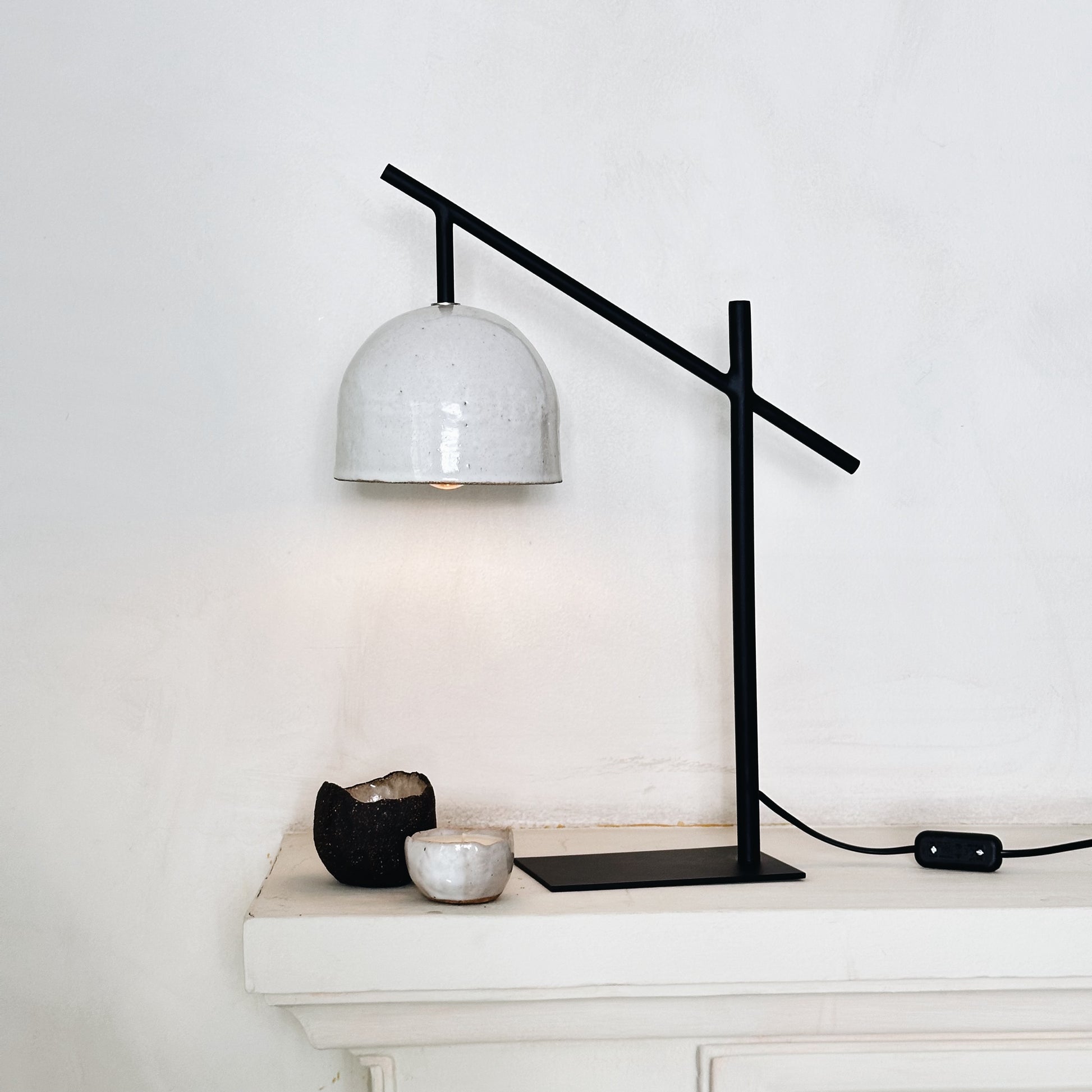 Lámpara de velador hecha de cerámica y metal negro es una lámpara elegante y contemporánea. La cerámica gres blanca agrega un toque artesanal y textura, mientras que el metal negro ofrece un estilo moderno y sofisticado. Esta combinación de materiales no solo promete durabilidad sino que también agrega un atractivo visual interesante a cualquier habitación.