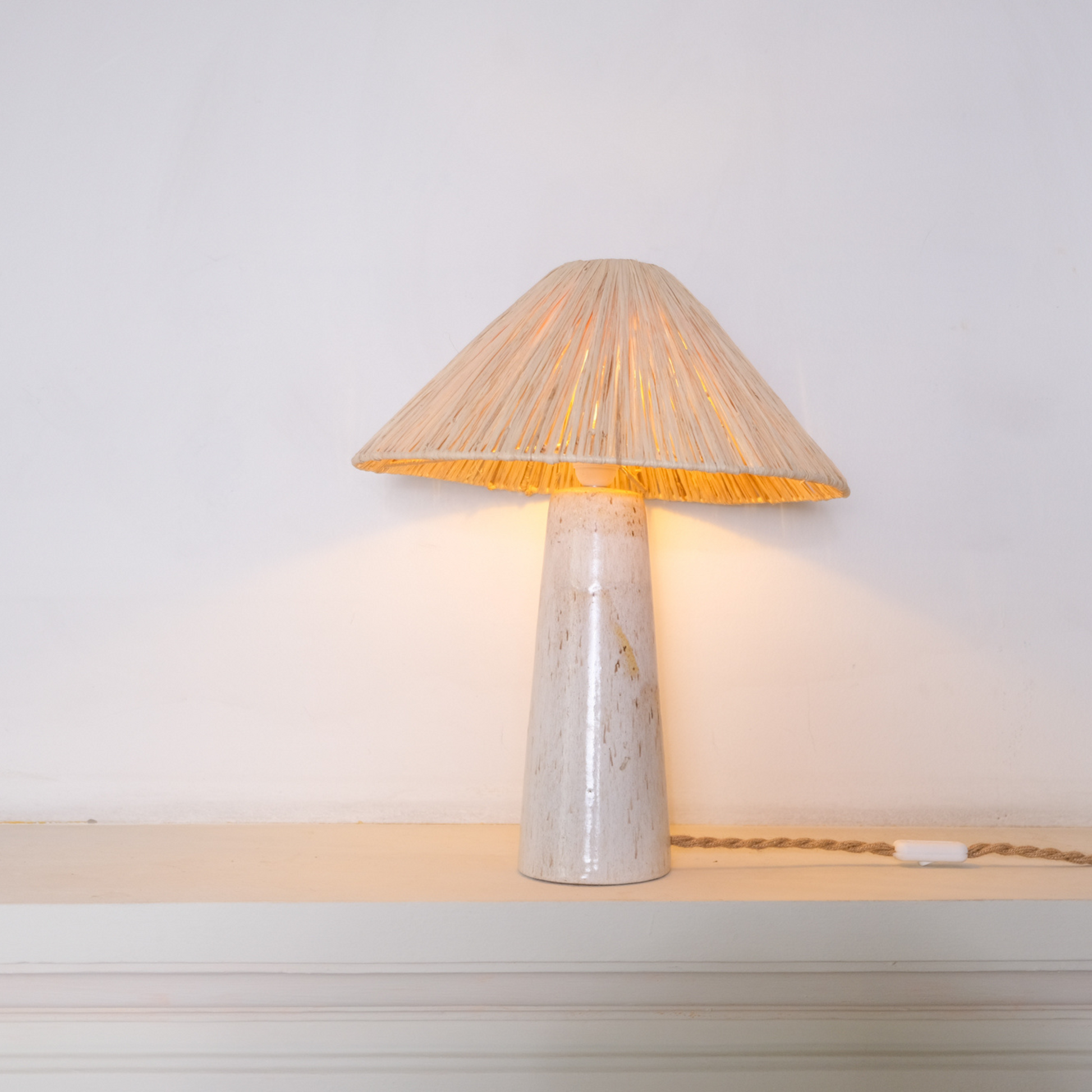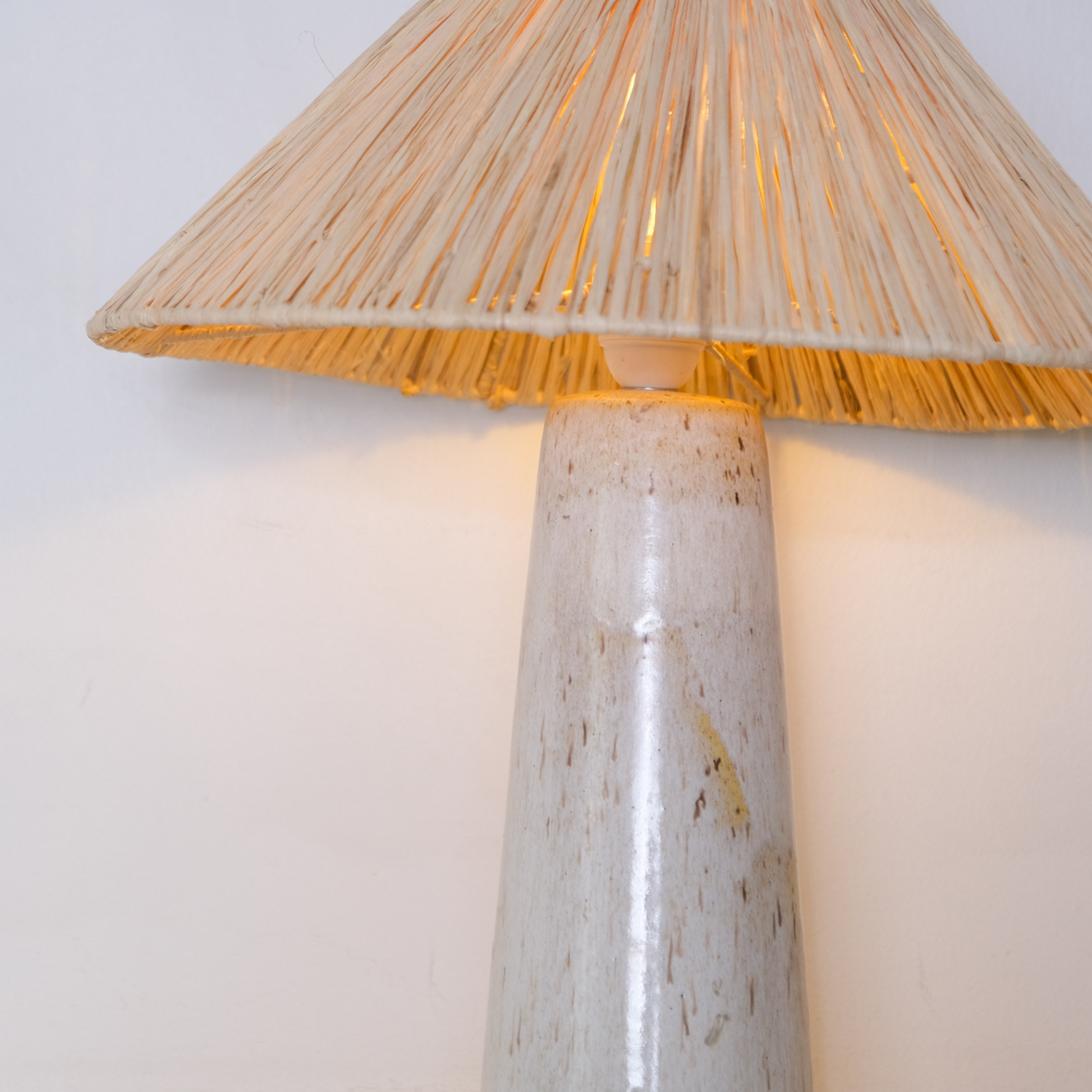 Lámpara alta de mesa, se destaca por su base de cerámica gres y una amplia pantalla de rafia, difunde la luz de manera expansiva, creando una iluminación suave y envolvente. La combinación de la cerámica gres y la fibra natural ofrece una estética contemporánea y orgánica.