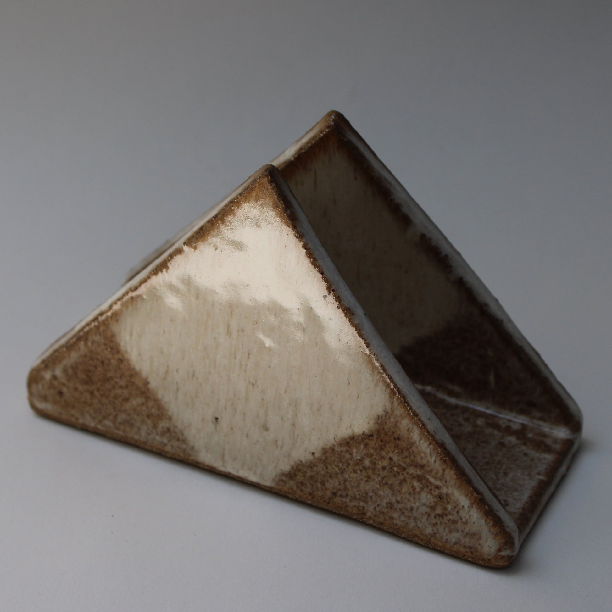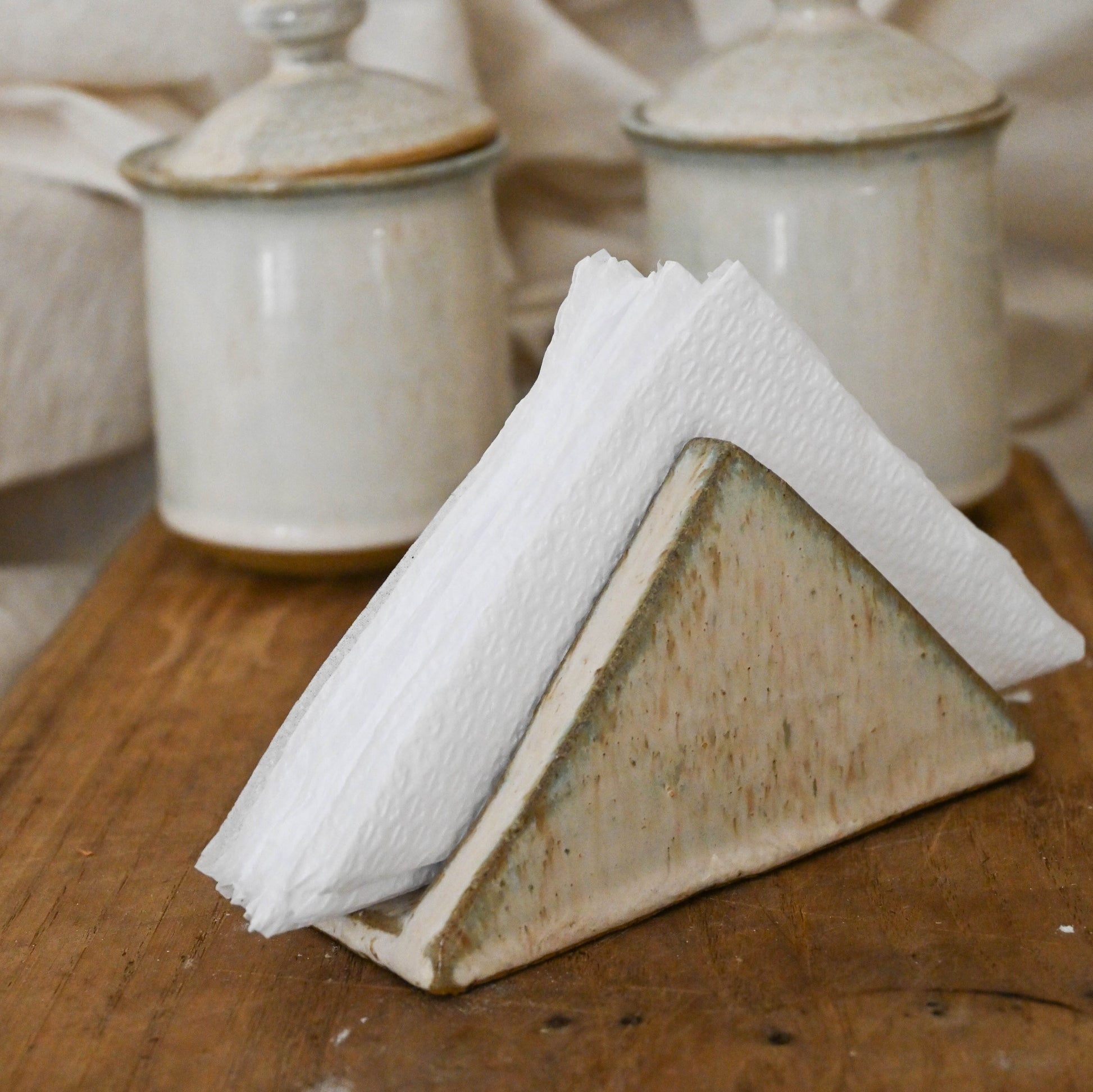 Servilletero de cerámica de gres color beige con puntos, en forma de triángulo. Ideal para agregar un toque elegante y moderno a tu mesa.