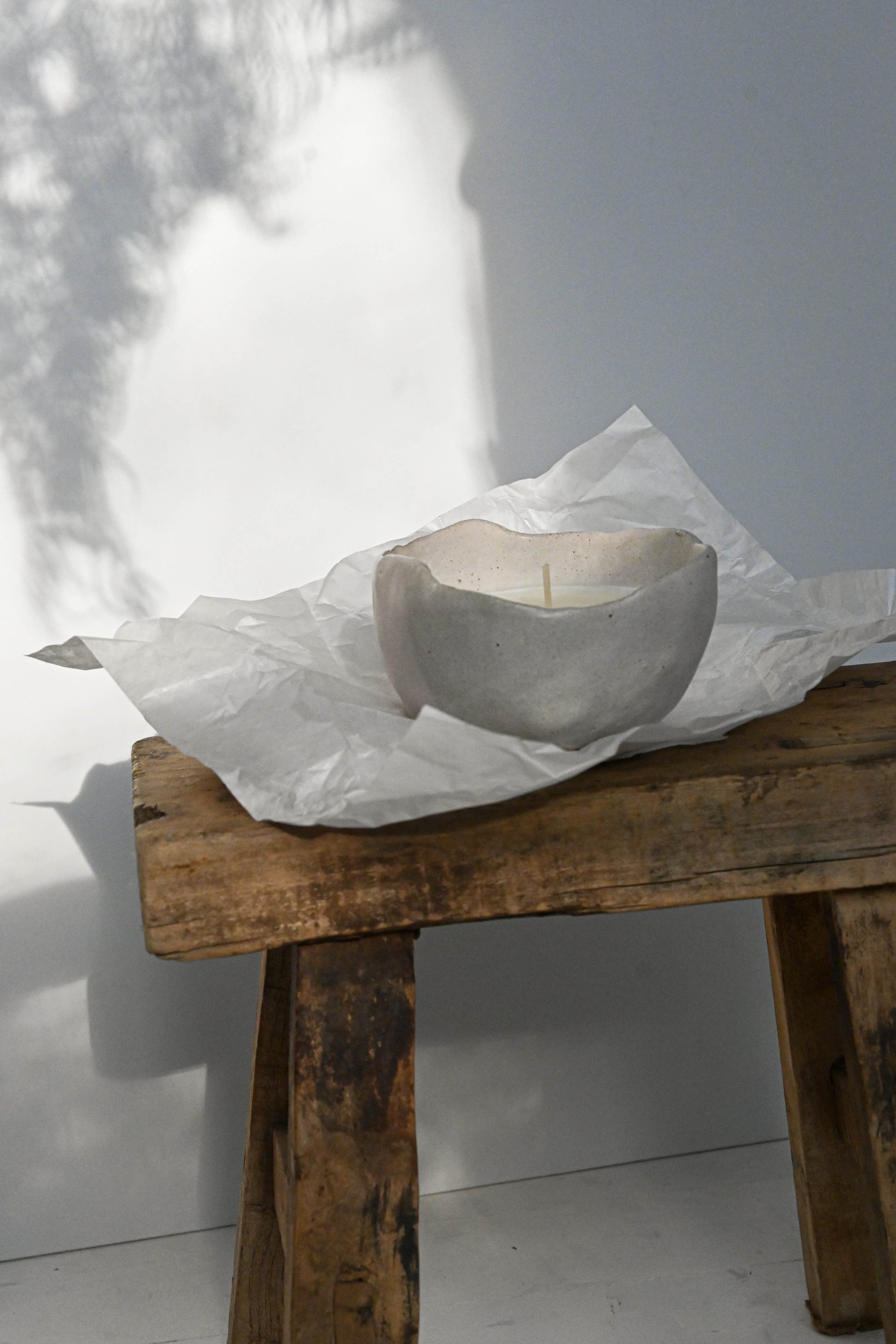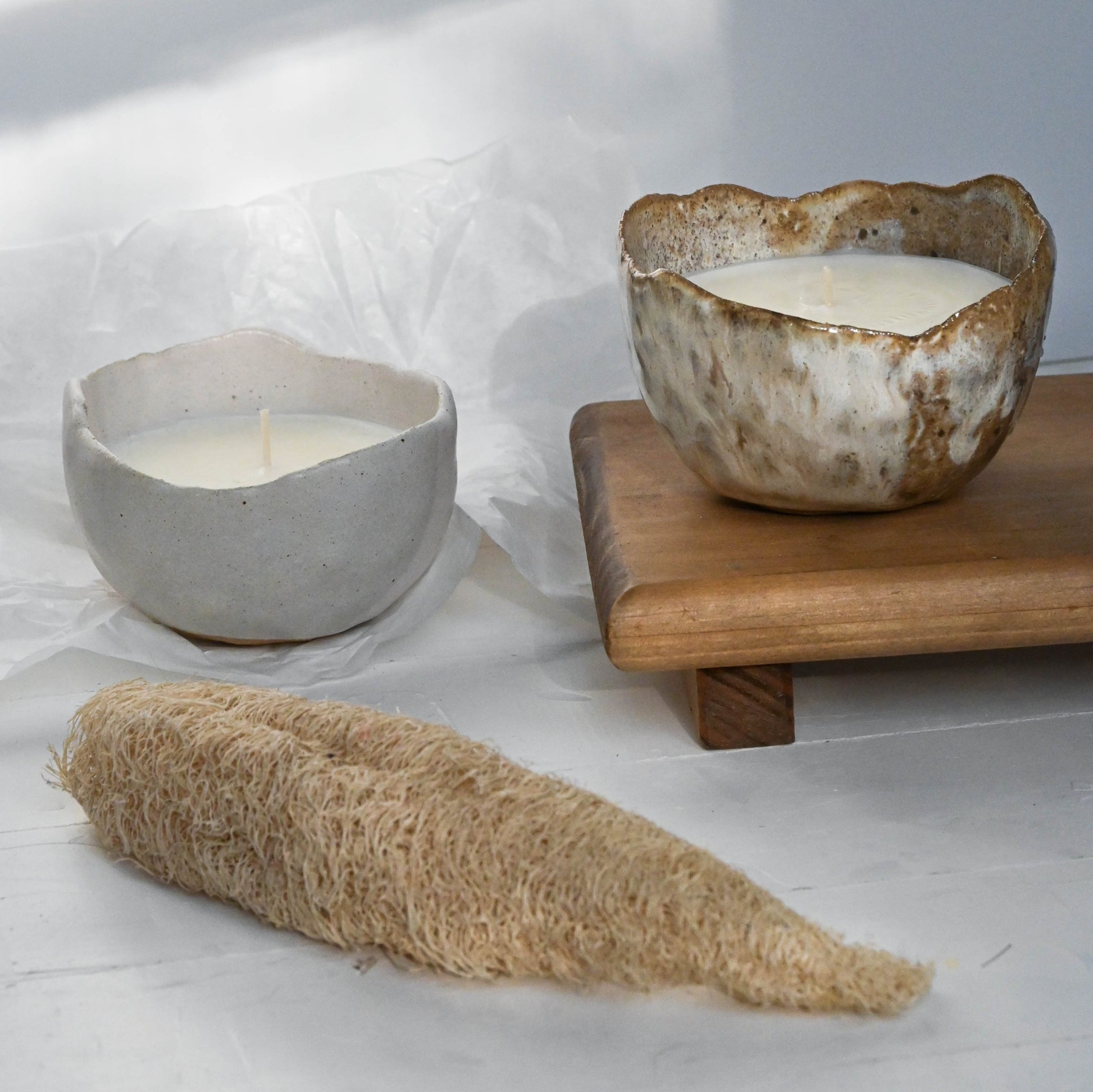 Vela de soya en cuenco de cerámica gres blanca esmaltada blanco brillante por su exterior.
